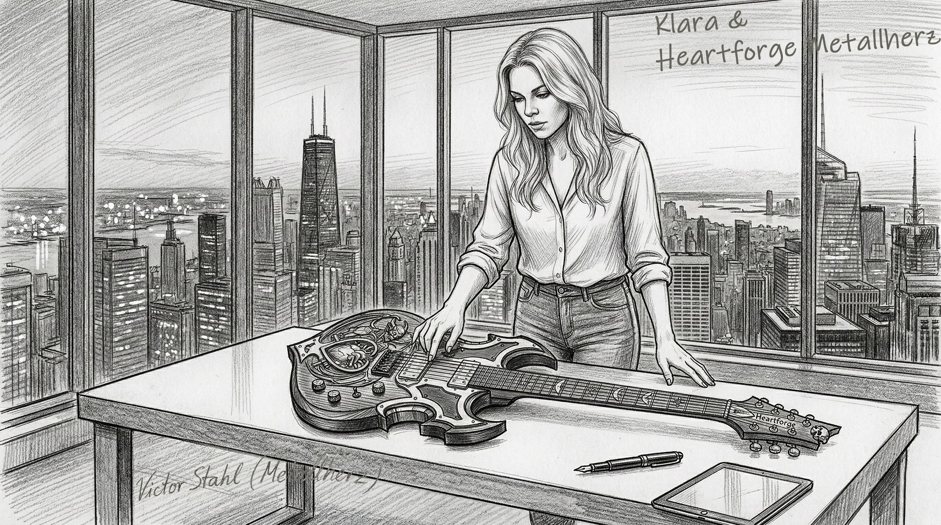 На столе лежал тестовый образец гитары. Подойдя она не коснулась инструмента. Только наклонила голову — чуть в сторону, как будто слушала невидимую частоту.
